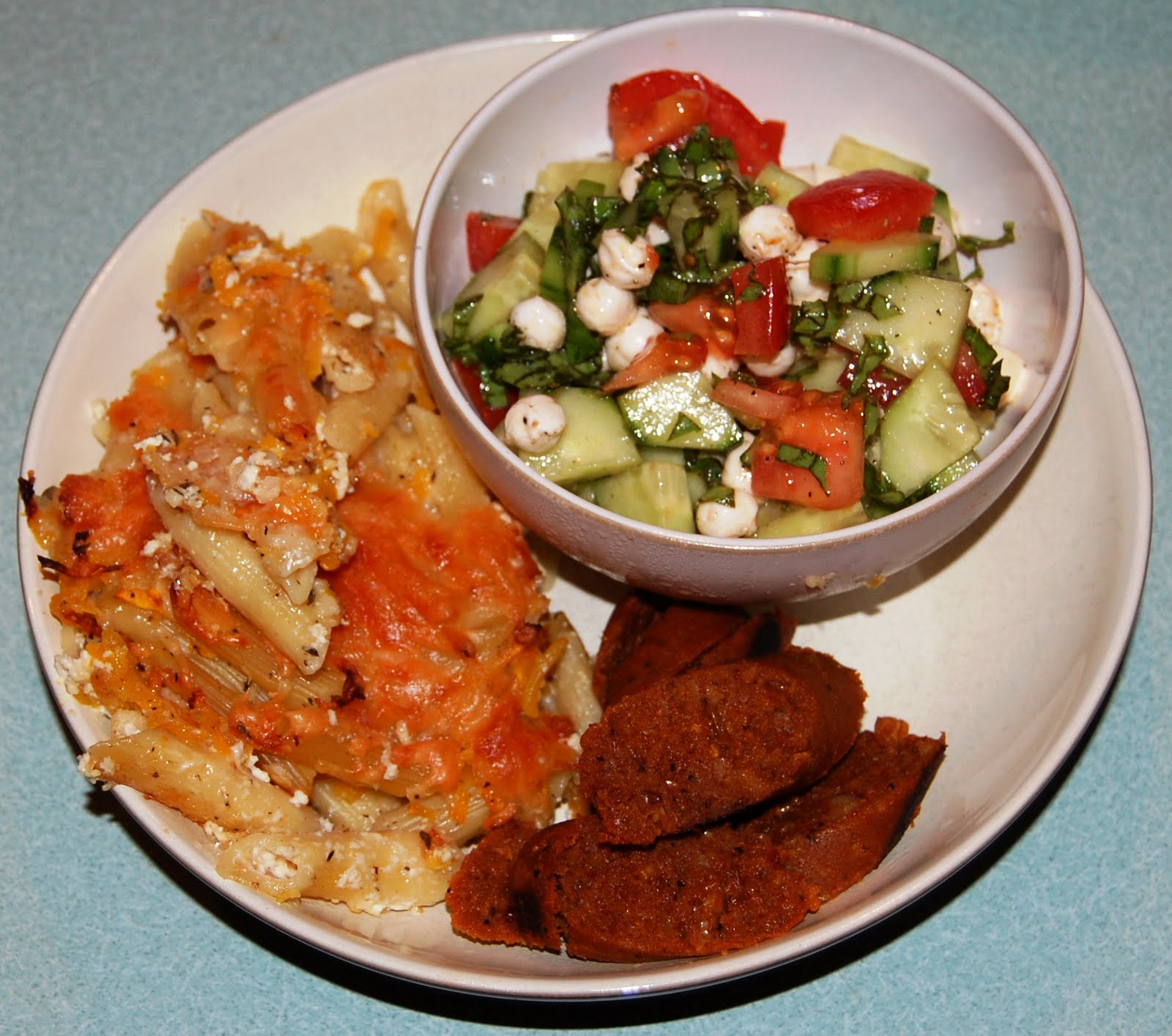 Last weekend I was pursuing a few of my favorite Food Blogs, when I came across this recipe (http://greengirl-alittlebitofeverything.blogspot.com/2011/04/baked-squash-pasta.html). I’ve been waiting to make it, and tonight was the night! I did make some adaptations of the original recipe. In addition to this dish, I made, what I call “Fresh Caprese Salad”. As some of you know, I don’t care for fresh tomatoes, so I add in cucumbers.