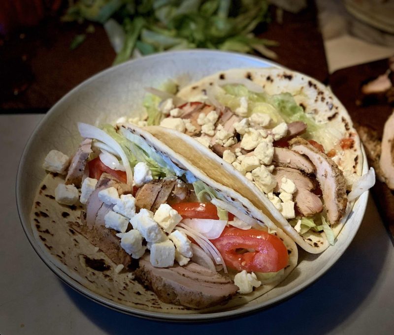Carve off slices of chicken to fill a flat bread. Top with onion slices, tomato slices, and tzatziki sauce.